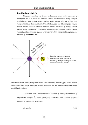 Gambar 1.17 Muatan liatrik q1 menghasilkan medan listrik di sekitarnya. Muatan q2 yang berada di sekitar