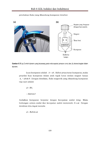 Gambar 6.13 (a) Contoh dynamo yang terpasang pada roda sepeda (amazon.com) dan (b) skema bagian dalam