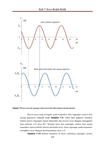 Gambar 7.9 Kurva arus dan tegangan ketika arus bolak-balik melewati sebuah kapasitor