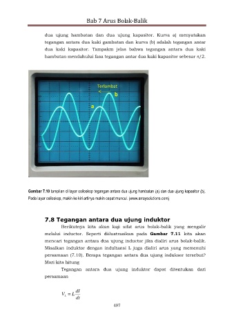 Gambar 7.10 tampilan di layar osiloskop tegangan antara dua ujung hambatan (a) dan dua ujung kapasitor (b).