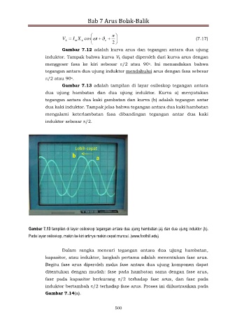 Gambar 7.13 tampilan di layar osiloskop tegangan antara dua ujung hambatan (a) dan dua ujung induktor (b).