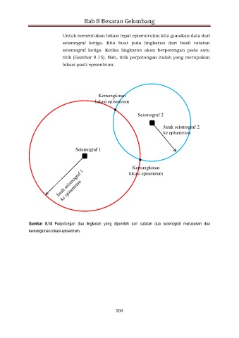 Gambar 8.14 Perpotongan dua lingkaran yang diperoleh dari catatan dua seismograf merupakan dua