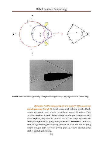 Gambar 8.24 Gambar muka gelombang ketika pesawat bergerak dengan laju yang melebihi laju rambat bunyi.