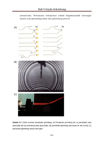 Gambar 9.1 Contoh peristiwa pemantulan gelombang. (A) Pemantulan gelombang tali: (a) pemantulan pasa
