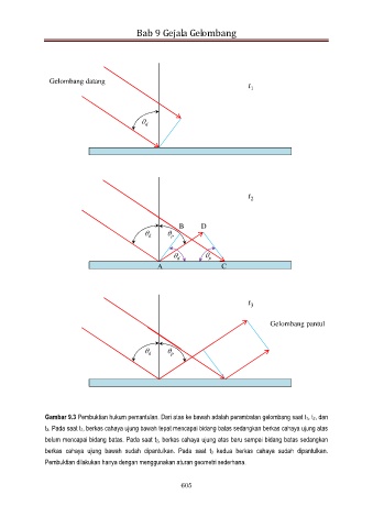 Gambar 9.3 Pembuktian hukum pemantulan. Dari atas ke bawah adalah perambatan gelombang saat t1, t2, dan