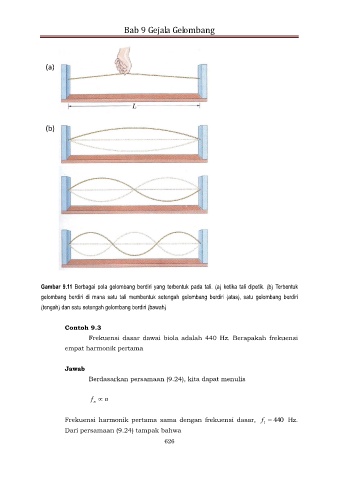 Gambar 9.11 Berbagai pola gelombang berdiri yang terbentuk pada tali. (a) ketika tali dipetik. (b) Terbentuk