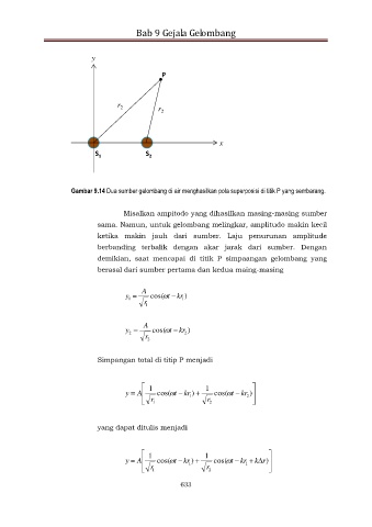Gambar 9.14 Dua sumber gelombang di air menghasilkan pola superposisi di titik P yang sembarang.
