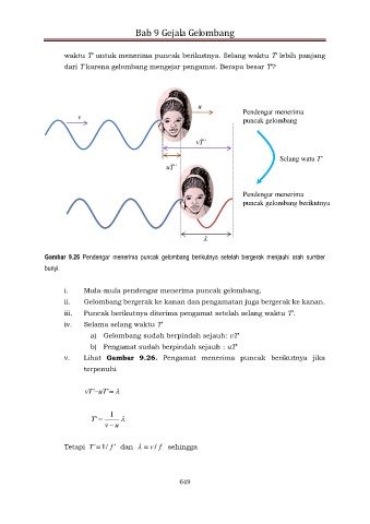 Gambar 9.26 Pendengar menerima puncak gelombang berikutnya setelah bergerak menjauhi arah sumber