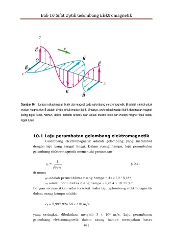 Gambar 10.1 Ilustrasi osilasi medan listrik dan magnet pada gelombang elektromagnetik. B adalah simbol untuk