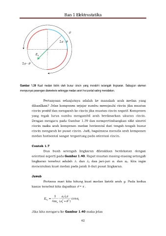 Gambar 1.39 Kuat medan listrik oleh busur cincin yang melebihi setengah lingkaran. Sebagian elemen