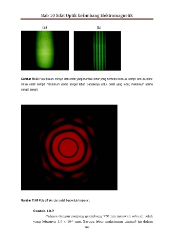 Gambar 10.59 Pola difraksi cahaya dari celah yang memiliki lebar yang berbeda-beda (a) sempit dan (b) lebar.