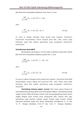 Berdasarkan persamaan (10.61) maka interfernsi destruktif terjadi