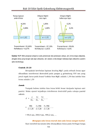 Gambar 10.71 Efek pelapisan antipantul pada pemantulan dan penerusan cahaya. (kiri) lensa tanpa antipantul,