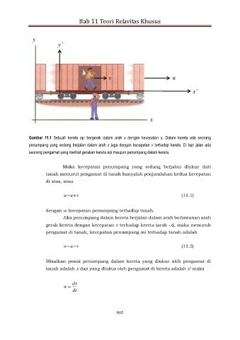 Gambar 11.1 Sebuah kereta api bergerak dalam arah x dengan kecepatan u. Dalam kereta ada seorang