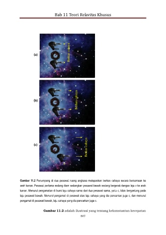 Gambar 11.2 Penumpang di dua pesawat ruang angkasa melepaskan berkas cahaya secara bersamaan ke