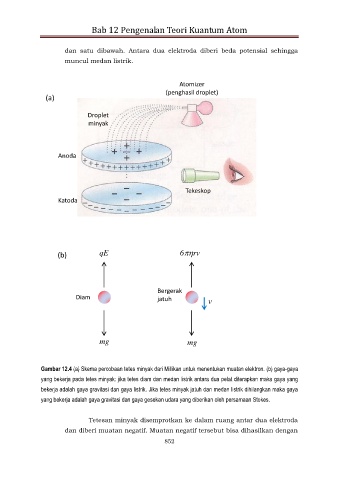 Gambar 12.4 (a) Skema percobaan tetes minyak dari Millikan untuk menentukan muatan elektron. (b) gaya-gaya