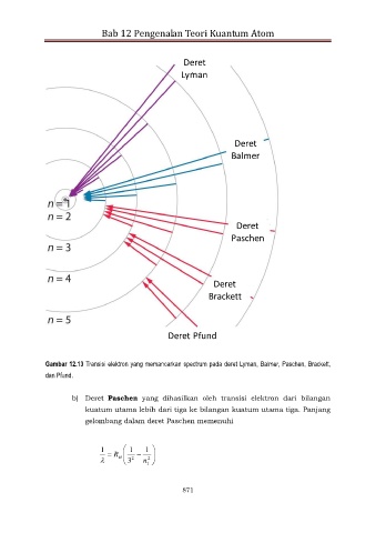 Gambar 12.13 Transisi elektron yang memancarkan spectrum pada deret Lyman, Balmer, Paschen, Brackett,