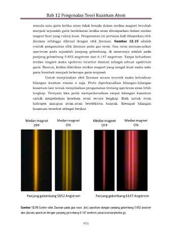 Gambar 12.15 Contoh efek Zeeman pada gas neon. (kiri) spectrum dengan panjang gelombang 5.852 anstrom