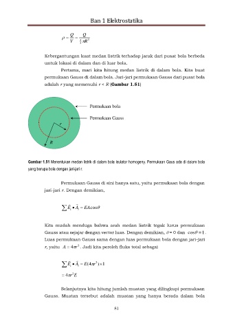 Gambar 1.51 Menentukan medan listrik di dalam bola isulator homogeny. Permukaan Gaus ada di dalam bola