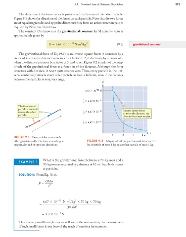 The gravitational force of Eq. (9.1) is an inverse-square force: it decreases by a