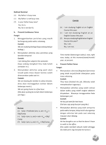 1 (–) Subj + (am, is, are) + not + V + Obj/ maupun akan datang.