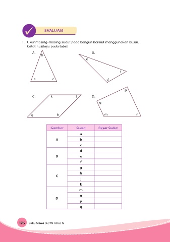 1. Ukur masing-masing sudut pada bangun berikut menggunakan busur. Catat hasilnya pada tabel. A. B. b e f a c d p C. k l D. q g h m n Gambar Sudut Besar Sudut a A b c d B e f g h C j k m n D p q 176 Buku Siswa SD/MI Kelas IV
