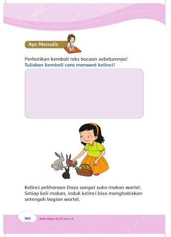 Ayo Menulis Perhatikan kembali teks bacaan sebelumnya! Tuliskan kembali cara merawat kelinci! Kelinci peliharaan Dayu sangat suka makan wortel. Setiap kali makan, induk kelinci bisa menghabiskan setengah bagian wortel. 160 Buku Siswa SD/MI Kelas III