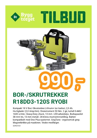 Kompakt 18 V Bor/-Skrutrekker.Lithium+ Ion batteri, 2,0 Ah.