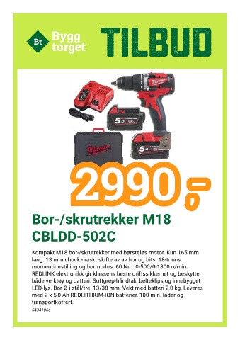 LED-lys. Bor Ø i stål/tre: 13/38 mm. Vekt med batteri 2,0 kg. Leveres