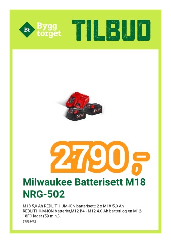 TILBUD 2790 2790 2790 Milwaukee Batterisett M18 NRG-502 M18 5,0 Ah REDLITHIUM-ION batterisett: 2 x M18 5,0 Ah REDLITHIUM-ION batterier,M12 B4 - M12 4.0 Ah batteri og en M12- 18FC lader (59 min.). 51528472