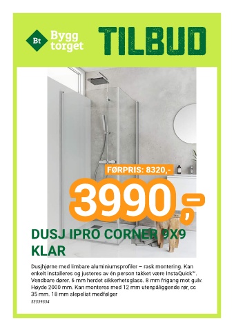 Dusjhjørne med limbare aluminiumsprofiler – rask montering. Kan
