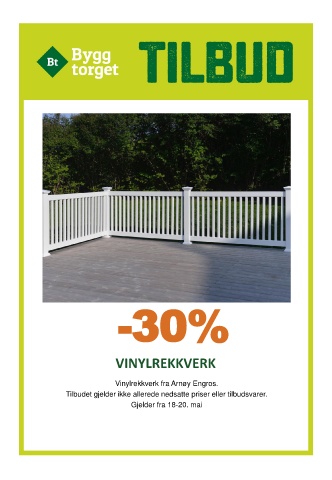 -30% VINYLREKKVERK Vinylrekkverk fra Arnøy Engros. Tilbudet gjelder ikke allerede nedsatte priser eller tilbudsvarer. Gjelder fra 18-20. mai