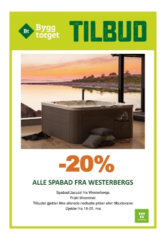 -20% ALLE SPABAD FRA WESTERBERGS Spabad/Jacuzzi fra Westerbergs. Frakt tilkommer. Tilbudet gjelder ikke allerede nedsatte priser eller tilbudsvarer. Gjelder fra 18-20. mai