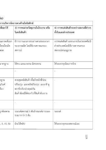 1) การจัดการการรับหรือส่งสินค้า และ 2) การคัดเลือกบรรจุภัณฑ์เพื่อมาใช้ 3) การขนถ่ายวัสดุภายในโรงงาน หรือ 4) การขนส่งสินค้าระหว่างสถานที่ต่างๆ