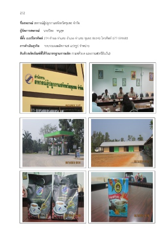 212 ชื่อสหกรณ์ สหกรณ์ผู้ปลูกกาแฟจังหวัดชุมพร จ ากัด ผู้จัดการสหกรณ์ นายปิยะ หนูสุด ที่ตั้ง เบอร์โทรศัพท์ 274 ต าบล ท่าแซะ อ าเภอ ท่าแซะ ชุมพร 86140 โทรศัพท์ 077-599683 การด าเนินธุรกิจ รวบรวมผลผลิตกาแฟ แปรรูป จ าหน่าย สินค้า/ผลิตภัณฑ์ที่ได้รับมาตรฐานการผลิต กาแฟคั่วบด และกาแฟ(ทรีอินวัน)