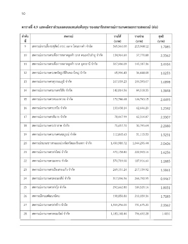 ตารางที่ 4.9 แสดงอัตราส่วนผลตอบแทนต่อต้นทุน ของสมาชิกสหกรณ์การเกษตรแยกรายสหกรณ์ (ต่อ)