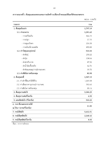 ตารางผนวกที่ 1 ต้นทุนและผลตอบแทนการผลิตข้าวเปลือกเจ้าหอมมะลิอินทรีย์ของเกษตรกร