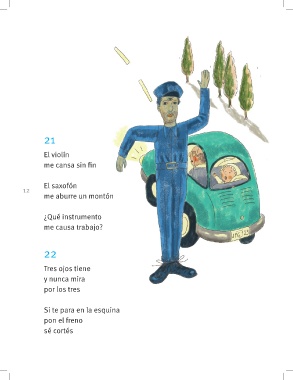 21 El violín me cansa sin fin 12 El saxofón me aburre un montón ¿Qué instrumento me causa trabajo? 22 Tres ojos tiene y nunca mira por los tres Si te para en la esquina pon el freno sé cortés