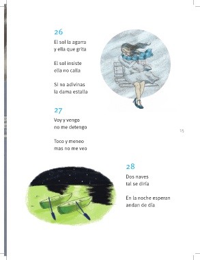 26 15 El sol la agarra 28 y ella que grita Dos naves El sol insiste tal se diría ella no calla En la noche esperan andan de día Si no adivinas la dama estalla 27 Voy y vengo no me detengo Toco y meneo mas no me veo