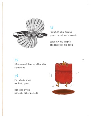 37 Perlas de agua serena gemas que el mar escondía escasas en la alegría abundantes en la pena 35 19 ¿Qué animal lleva en el bolsillo su tesoro? 36 Escucha tu sueño recibe tu queja Doncella o vieja pones tu cabeza en ella