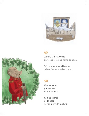 49 24 Camina la niƱa de oro cierro los ojos y es dama de plata Del cielo ya huye el tesoro quien dice su nombre le ata 50 Con su panza y armadura miedo procura Con su cuerno en la nariz se me muere la lombriz