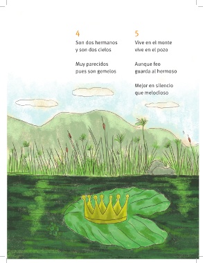 4 5 Son dos hermanos Vive en el monte y son dos cielos vive en el pozo Muy parecidos Aunque feo pues son gemelos guarda al hermoso Mejor en silencio que melodioso 5