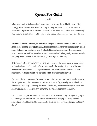 Fred is angrier and hungrier. He vows to disappoint the mocking frog. Silently he waits.
