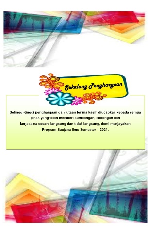 Setinggi-tinggi penghargaan dan jutaan terima kasih diucapkan kepada semua pihak yang telah memberi sumbangan, sokongan dan kerjasama secara langsung dan tidak langsung, demi menjayakan Program Saujana Ilmu Semester 1 2021.