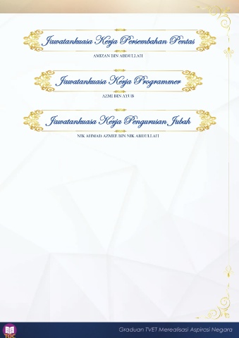 Jawatankuasa Kerja Persembahan Pentas AMIZAN BIN ABDULLAH Jawatankuasa Kerja Programmer AZMI BIN AYUB Jawatankuasa Kerja Pengurusan Jubah NIK AHMAD AZMEE BIN NIK ABDULLAH