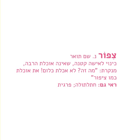 ִצּפֹור נ .שם תואר כינוי לאישה קטנה ,שאינה אוכלת הרבה, מנקרת" :מה זה? לא אכלת כלום! את אוכלת כמו ציפור" ראי גם :חתלתולה; פרגית