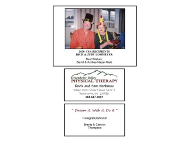 2020 CSA RECIPIENTS RICH & JUDY LOHMEYER Best Wishes, David & Andrea Nazar-Maki Kevin and Pam Workman 3942 Davis Stuart Road, Suite 3 Ronceverte, WV 24970 304-647-3987 “ Dream it. Wish it. Do it “ Congratulations! Brentz & Carolyn Thompson