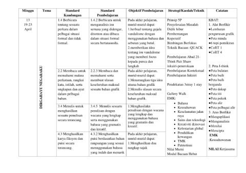 Minggu Tema Standard Standard Objektif Pembelajaran Strategi/Kaedah/Teknik Catatan