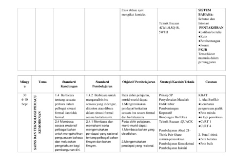 Mingg Tema Standard Standard Objektif Pembelajaran Strategi/Kaedah/Teknik Catatan