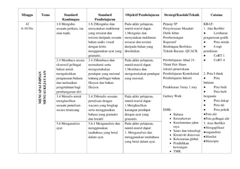 Minggu Tema Standard Standard Objektif Pembelajaran Strategi/Kaedah/Teknik Catatan